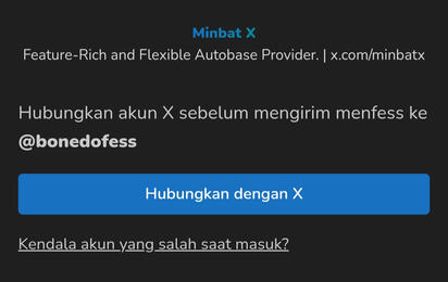 Buka akun Twitter/X yang sudah difollback oleh BONEDOFESS lalu buka link https://minbat.co/menfess/bonedofess atau link yang ada di profile BONEDOFESS. Klik button "Hubungkan dengan X" dan authorization.