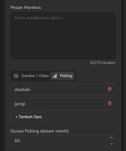 Jika ingin membuat polling, klik tab "Polling". Tambahkan beberapa opsi polling yang diinginkan dengan men-klik "+ Tambah Opsi", set durasi polling di "Durasi Polling (dalam menit)".
