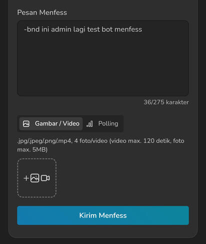 Ketik menfess di kolom menfess, jangan lupa pakai trigger -bnd agar menfess dapat terkirim. Jika mau mengirim foto silahkan submit foto/video (maksimal 4 foto/video) dengan men-klik icon +foto/video (video max 120 detik, foto max 5MB). jika terdapat error kalian masih bisa mengirimkan foto/video dengan mencantumkan link foto/video saja.