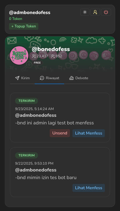 Kamu bisa melihat riwayat menfess yang sudah kamu kirim di tab "Riwayat".