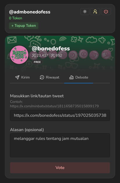 Jika kamu melihat ada menfess yang melanggar rules BONEDOFESS, kamu bisa mengajukan delvote pada tab "Delvote". Masukkan link/tautan tweet yang ingin di delvote di "Masukkan link/tautan tweet". Kalian bisa memberikan alasan kenapa tweet harus di delvote (jika perlu) pada "Alasan (opsional)". Lalu selanjutnya klik "Vote" untuk mengirim pengajuan delvote. Jika ada notice berhasil maka pengajuan delvote sudah berhasil dikirim.